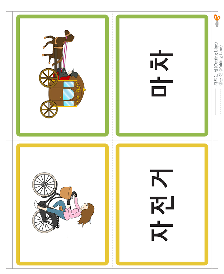 교통수단(마차,자전거)을 표현한 낱말 그림카드입니다. 가정이나 학교, 유치원,어린이집에서 유아기에 필요한 한글통글자 익히기, 사물인지, 부교재 등 다양한 영역에서 카드 활용이 가능합니다. 도서나 교재와 함께 활용하세요. 아주 훌륭한 자료가 될 것 입니다. 아래 카드를 출력후 가위로 잘라서 코팅지나 양면테이프, 벨크로 등을 붙여서 활용 할 수 있습니다. 다양한 카드 사용법을 공유하여 주세요. 많은 도움이 될것입니다.
