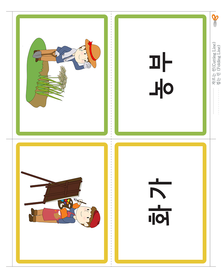 직업(농부,화가)을 표현한 낱말 그림카드입니다. 가정이나 학교, 유치원,어린이집에서 유아기에 필요한 한글통글자 익히기, 사물인지, 부교재 등 다양한 영역에서 카드 활용이 가능합니다. 도서나 교재와 함께 활용하세요. 아주 훌륭한 자료가 될 것 입니다. 아래 카드를 출력후 가위로 잘라서 코팅지나 양면테이프, 벨크로 등을 붙여서 활용 할 수 있습니다. 다양한 카드 사용법을 공유하여 주세요. 많은 도움이 될것입니다.