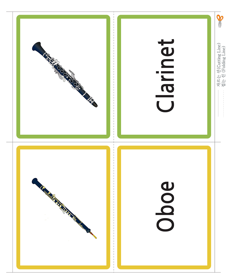 음악/악기(클라리넷,오보에)을 표현한 영어 단어 그림카드입니다. 가정이나 학교, 유치원,어린이집에서 유아기에 필요한 영어 단어 익히기, 사물인지, 부교재 등 다양한 영역에서 카드 활용이 가능합니다. 도서나 교재와 함께 활용하세요. 아주 훌륭한 자료가 될 것 입니다. 아래 카드를 출력후 가위로 잘라서 코팅지나 양면테이프, 벨크로 등을 붙여서 활용 할 수 있습니다. 다양한 카드 사용법을 공유하여 주세요. 많은 도움이 될것입니다.