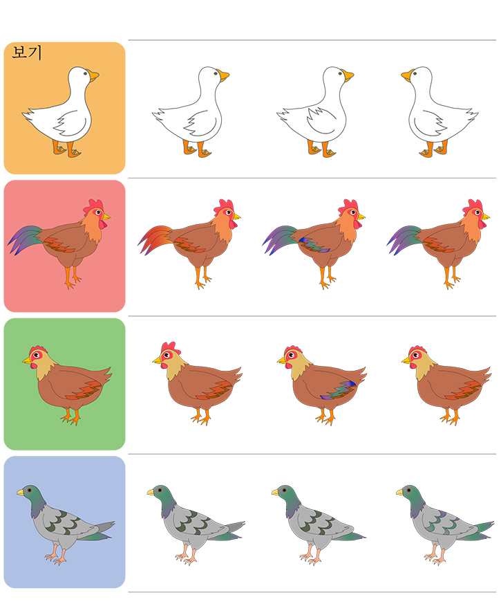 그림의 예제(오리,수닭,암닭,비둘기)를 보고 똑같은 그림을 찾아보세요. 사물을 인지하고 비교 판단하는 능력을 키웁니다. 모양,위치,색상등 모든 것을 고려해 보세요. 아주 재밌는 게임이 될것입니다. 선생님, 부모님, 친구와 함께 즐겁게 게임해 보세요.