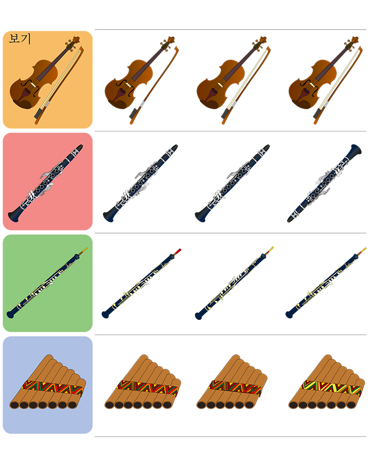 그림의 예제(바이올린,클라리넷,오보에,팬파이프)를 보고 똑같은 그림을 찾아보세요. 사물을 인지하고 비교 판단하는 능력을 키웁니다. 모양,위치,색상 등 모든 것을 고려해 보세요. 아주 재밌는 게임이 될것입니다. 선생님, 부모님, 친구와 함께 즐겁게 게임해 보세요.