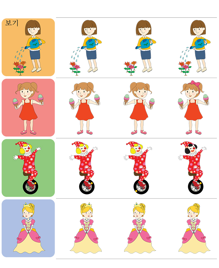 그림의 예제(물주기,아이스크림,서커스,공주)를 보고 똑같은 그림을 찾아보세요. 사물을 인지하고 비교 판단하는 능력을 키웁니다. 모양,위치,색상 등 모든 것을 고려해 보세요. 아주 재밌는 게임이 될것입니다. 선생님, 부모님, 친구와 함께 즐겁게 게임해 보세요.