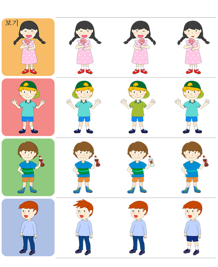 그림의 예제(막대사탕,소년,콜라,남자아이)를 보고 똑같은 그림을 찾아보세요. 사물을 인지하고 비교 판단하는 능력을 키웁니다. 모양,위치,색상 등 모든 것을 고려해 보세요. 아주 재밌는 게임이 될것입니다. 선생님, 부모님, 친구와 함께 즐겁게 게임해 보세요.