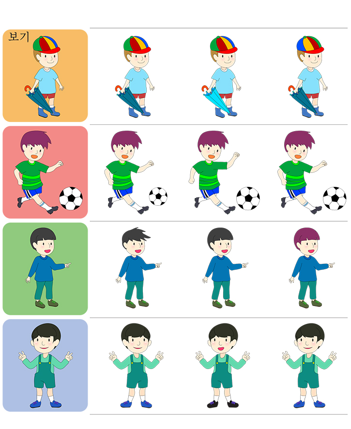 그림의 예제(우산,축구,소년)를 보고 똑같은 그림을 찾아보세요. 사물을 인지하고 비교 판단하는 능력을 키웁니다. 모양,위치,색상 등 모든 것을 고려해 보세요. 아주 재밌는 게임이 될것입니다. 선생님, 부모님, 친구와 함께 즐겁게 게임해 보세요.