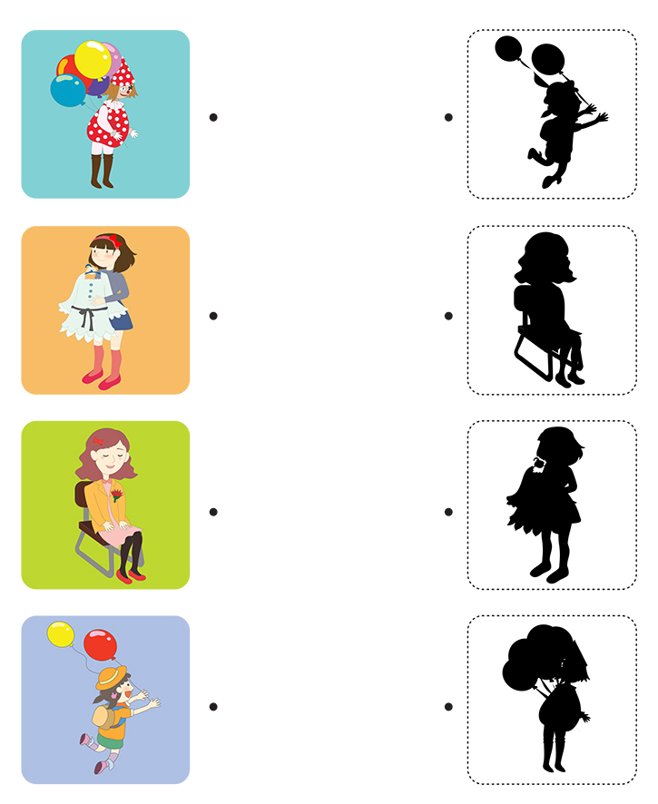 이번 학습지는 다양한 그림을 보고 일치하는 그림자를 찾아 선을 열결하는 게임입니다. 아래 여러가지 그림(피에로,의상판매원,선생님,유치원생)을 보고 알맞는 그림자를 찾아 선을 열결하세요. 학습을 통해 직관력과 관찰력 향상에 도움이됩니다. 친구들과 함께 재미있게 풀어보세요.