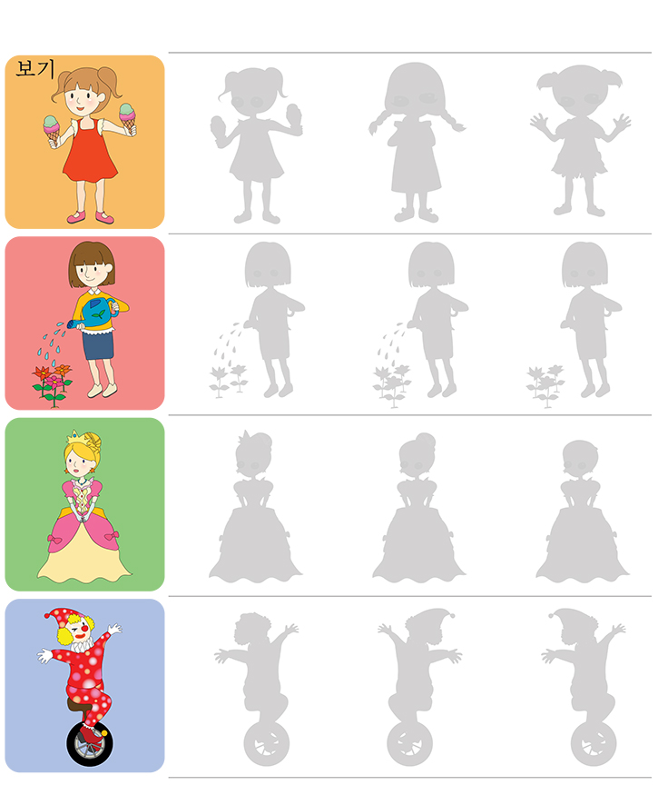 이번 학습지는 다양한 그림을 보고 일치하는 그림자를 찾아 표시하는 게임입니다. 아래 여러가지 그림(아이스크림,꽃물주기,공주,서커스)을 보고 알맞는 그림자를 찾으세요. 학습을 통해 직관력과 관찰력 향상에 도움이됩니다. 친구들과 함께 재미있게 풀어보세요.