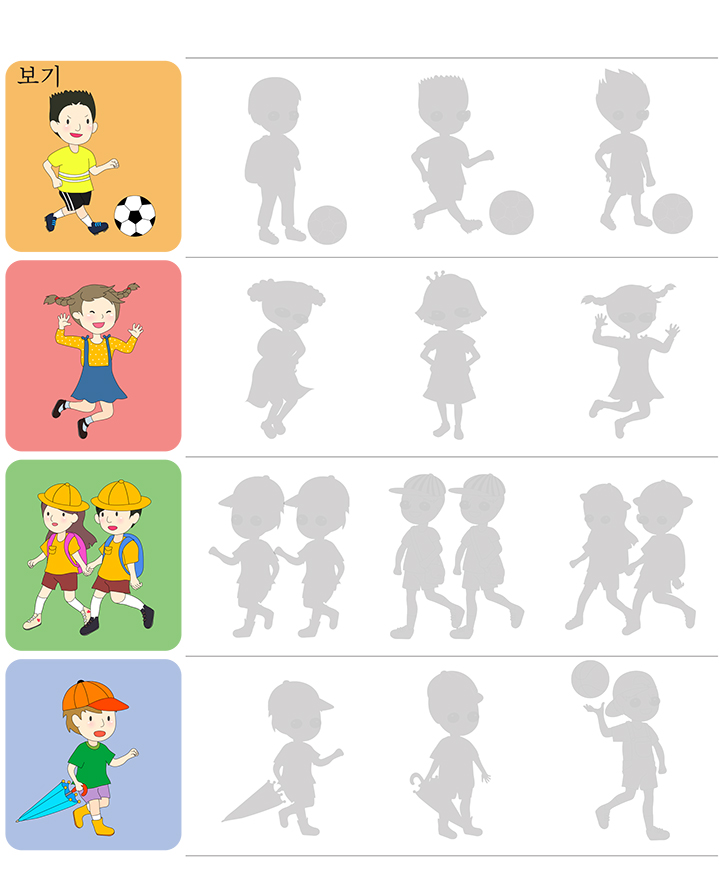 이번 학습지는 다양한 그림을 보고 일치하는 그림자를 찾아 표시하는 게임입니다. 아래 여러가지 그림(축구,소녀,유치원,우산)을 보고 알맞는 그림자를 찾으세요. 학습을 통해 직관력과 관찰력 향상에 도움이됩니다. 친구들과 함께 재미있게 풀어보세요.