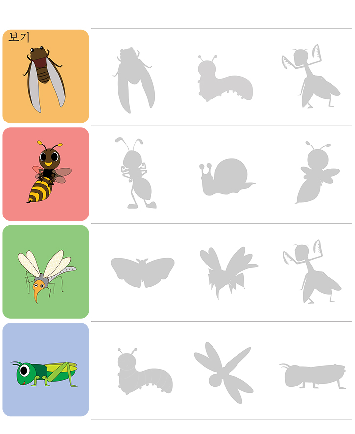 이번 학습지는 다양한 그림을 보고 일치하는 그림자를 찾아 표시하는 게임입니다. 아래 여러가지 그림(매미,벌,모기,메뚜기)을 보고 알맞는 그림자를 찾으세요. 학습을 통해 직관력과 관찰력 향상에 도움이됩니다. 친구들과 함께 재미있게 풀어보세요.