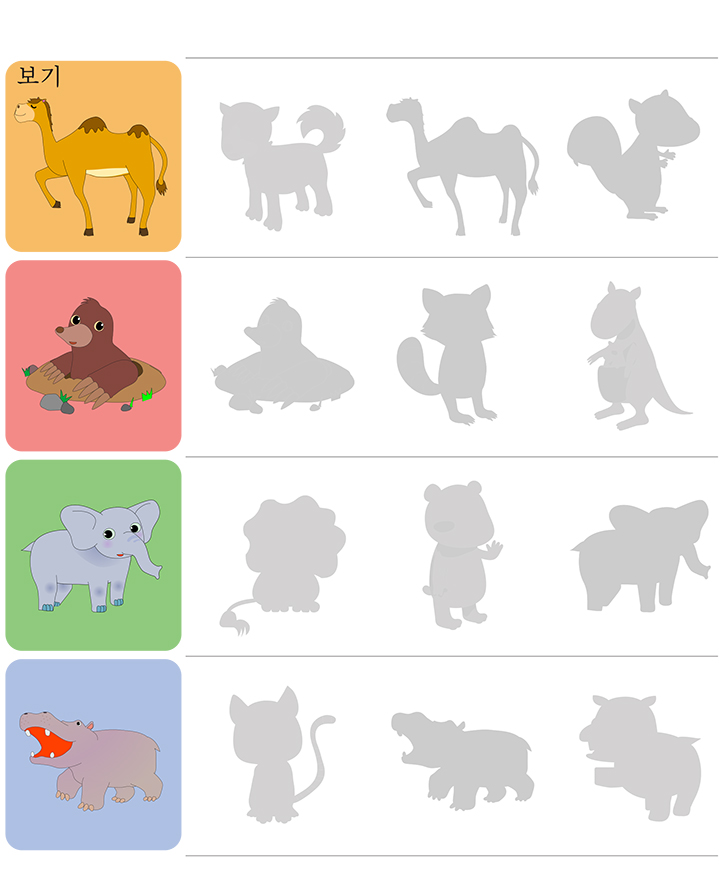 이번 학습지는 다양한 그림을 보고 일치하는 그림자를 찾아 표시하는 게임입니다. 아래 여러가지 그림(낙타,두더지,코끼리,하마)을 보고 알맞는 그림자를 찾으세요. 학습을 통해 직관력과 관찰력 향상에 도움이됩니다. 친구들과 함께 재미있게 풀어보세요.
