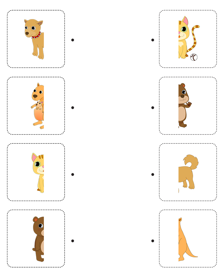 이번 학습지는 나눠진 그림을 찾아 선을 연결하는 게임입니다. 아래 그림(강아지,캥거루,고양이,곰)과 일치하는 나머지 반쪽을 찾아보세요. 이 학습은 직관력과 상상력,관찰력 향상에 도움이 됩니다. 선생님과 학부모님은 완성된 그림을 찾을 수 있도록 함께 아이들을 지도해 주세요.