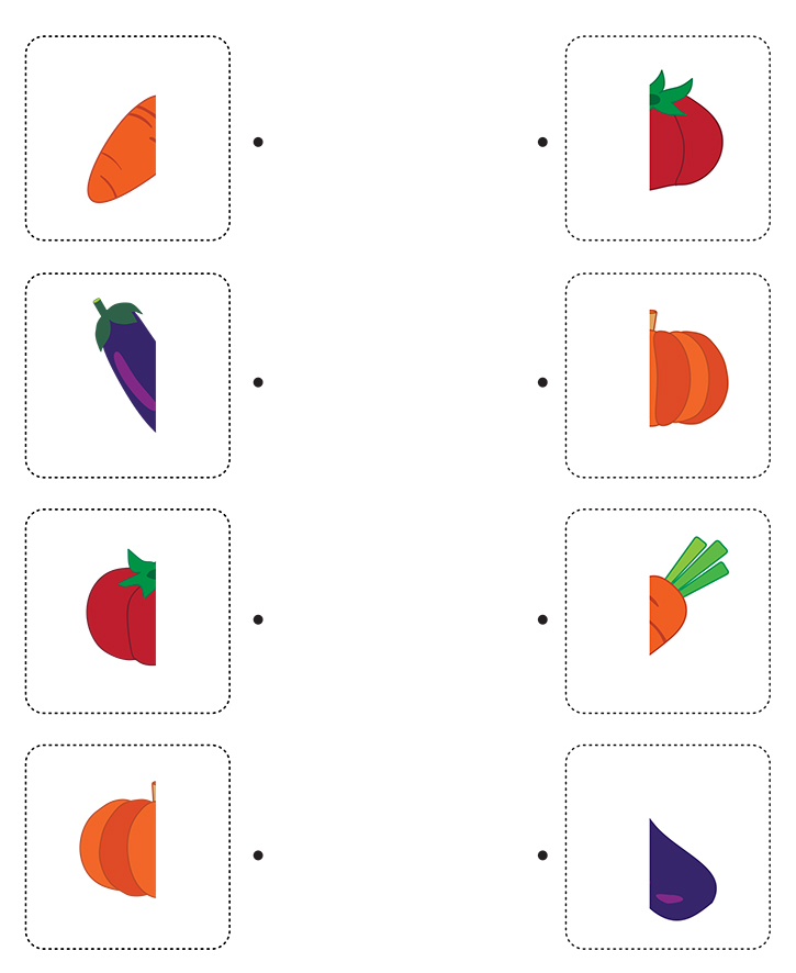 이번 학습지는 나눠진 그림을 찾아 선을 연결하는 게임입니다. 아래 그림(당근,가지,토마토,호박)과 일치하는 나머지 반쪽을 찾아보세요. 이 학습은 직관력과 상상력,관찰력 향상에 도움이 됩니다. 선생님과 학부모님은 완성된 그림을 찾을 수 있도록 함께 아이들을 지도해 주세요.