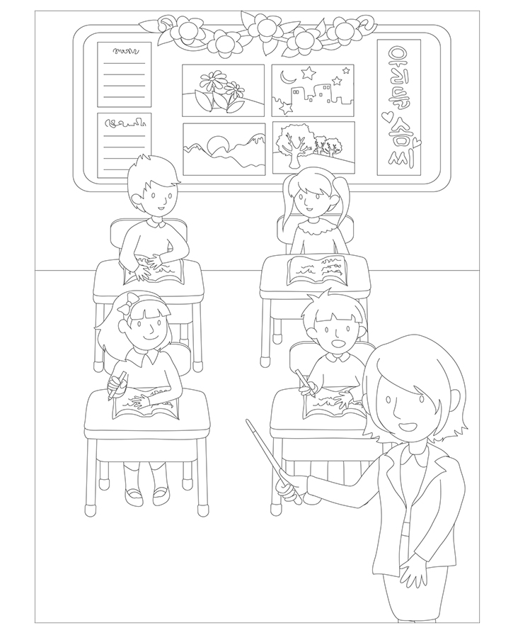 이번 학습지는 그림에 대한 주제쓰기와 색칠하기 입니다. 학생들이 선생님께 교육받는 그림입니다. (학교생활)에 대해 이야기 나눠보고 예쁘게 색칠하세요. 손근육 발달과 상상력과, 창의성, 색상에 대해서도 학습할 수 있습니다. 학부모님과 선생님은 아이들이 재밌게 학습할 수 있는 분위기와 공간을 마련해주세요. 친구들과 함께 재밌는 색칠공부를 해보세요. 또한 연관된 컨텐츠를 함께 활용하면 재밌는 놀이와 학습 도구가 될것입니다.