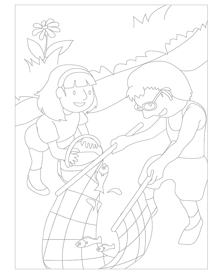 아래 그림을 예쁘게 색칠하고 (물고기잡기)에 대해 이야기 해보세요.