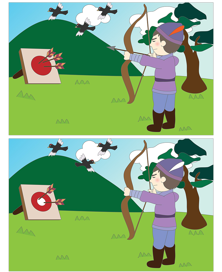 2개의 그림(주몽)을 비교해보면 서로 다른 부분이 있습니다. 서로 다른 부분 5곳을 찾아 표시하는 게임입니다. 모양,위치,색상등 모든 것을 고려해 보세요. 아주 재밌는 게임이 될것입니다. 창의성 발달과 분석,비교,사고 발달에 도움이 됩니다. 난의도에 따라 시간이 많이 걸릴수 있습니다. 선생님, 부모님, 친구와 함께 즐겁게 게임해보세요. 또한 그림에 나와 있는 주제에 대해 이야기 해보면서 다양한 연관수업이 가능합니다.