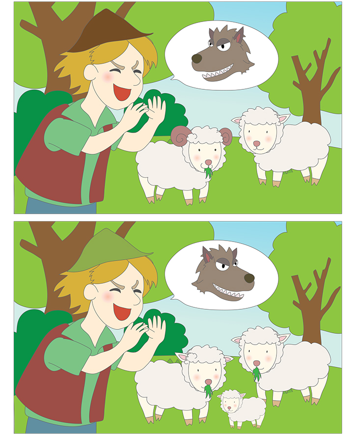 2개의 그림(양치기소년)을 비교해보면 서로 다른 부분이 있습니다. 서로 다른 부분 5곳을 찾아 표시하는 게임입니다. 모양,위치,색상등 모든 것을 고려해 보세요. 아주 재밌는 게임이 될것입니다. 창의성 발달과 분석,비교,사고 발달에 도움이 됩니다. 난의도에 따라 시간이 많이 걸릴수 있습니다. 선생님, 부모님, 친구와 함께 즐겁게 게임해보세요. 또한 그림에 나와 있는 주제에 대해 이야기 해보면서 다양한 연관수업이 가능합니다.