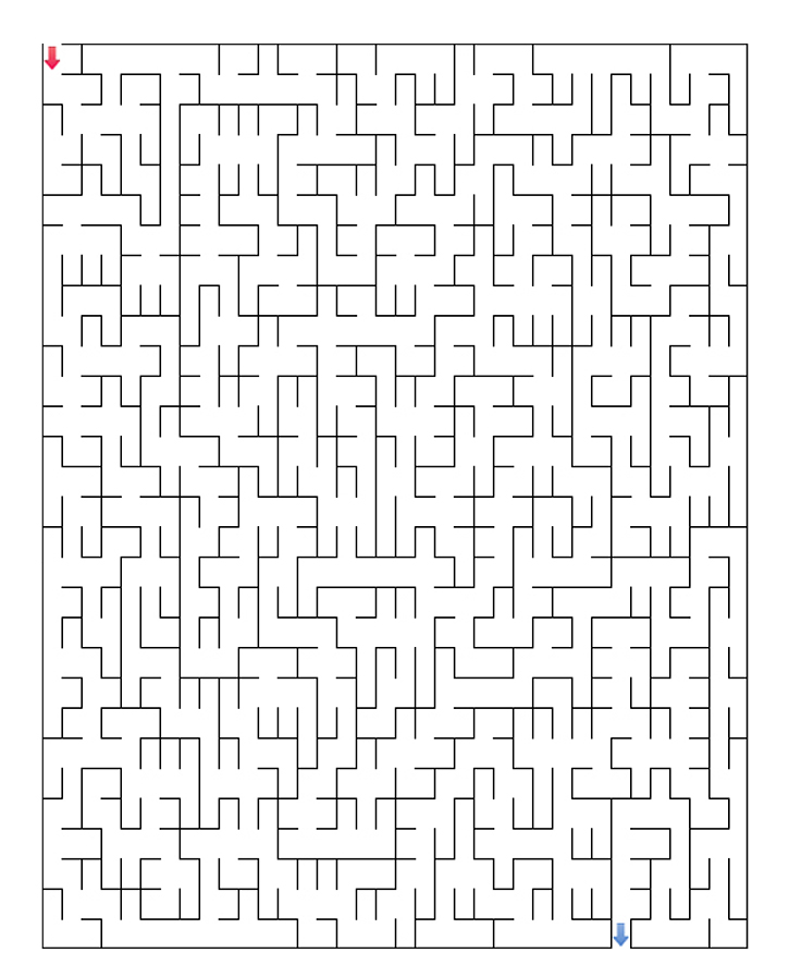 아래 그림을 보고 미로찾기(고급)를 해보세요. 빨간색 화살표에서 출발하여 파란색 화살표가 출구입니다. 미로찾기 게임은 사고력 발전과 창의성 발달에 많은 도움이 됩니다. 친구들과 함께 재미있게 풀어보세요.