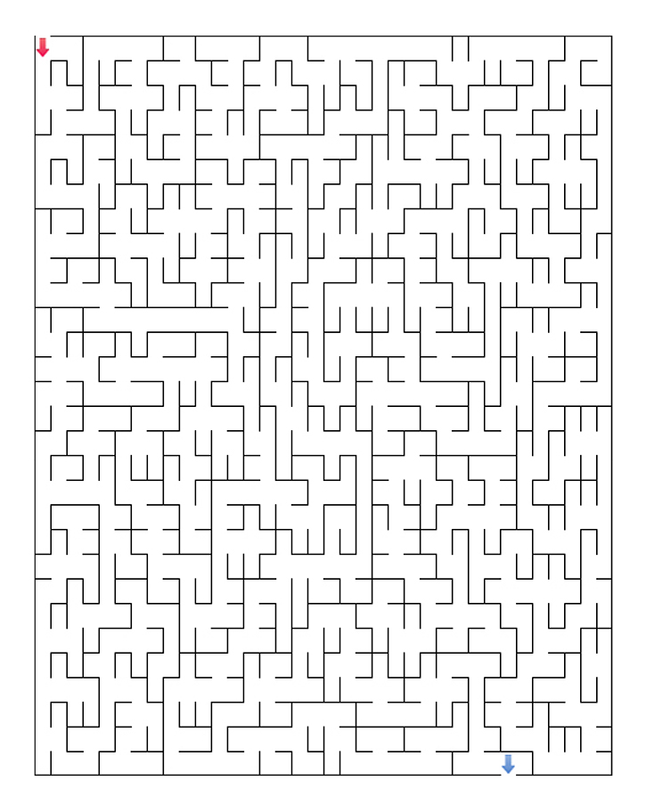 아래 그림을 보고 미로찾기(고급)를 해보세요. 빨간색 화살표에서 출발하여 파란색 화살표가 출구입니다. 미로찾기 게임은 사고력 발전과 창의성 발달에 많은 도움이 됩니다. 친구들과 함께 재미있게 풀어보세요.
