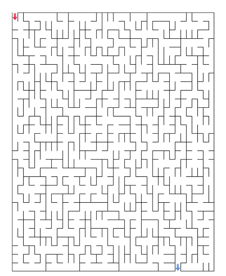 아래 그림을 보고 미로찾기(고급)를 해보세요. 빨간색 화살표에서 출발하여 파란색 화살표가 출구입니다. 미로찾기 게임은 사고력 발전과 창의성 발달에 많은 도움이 됩니다. 친구들과 함께 재미있게 풀어보세요.