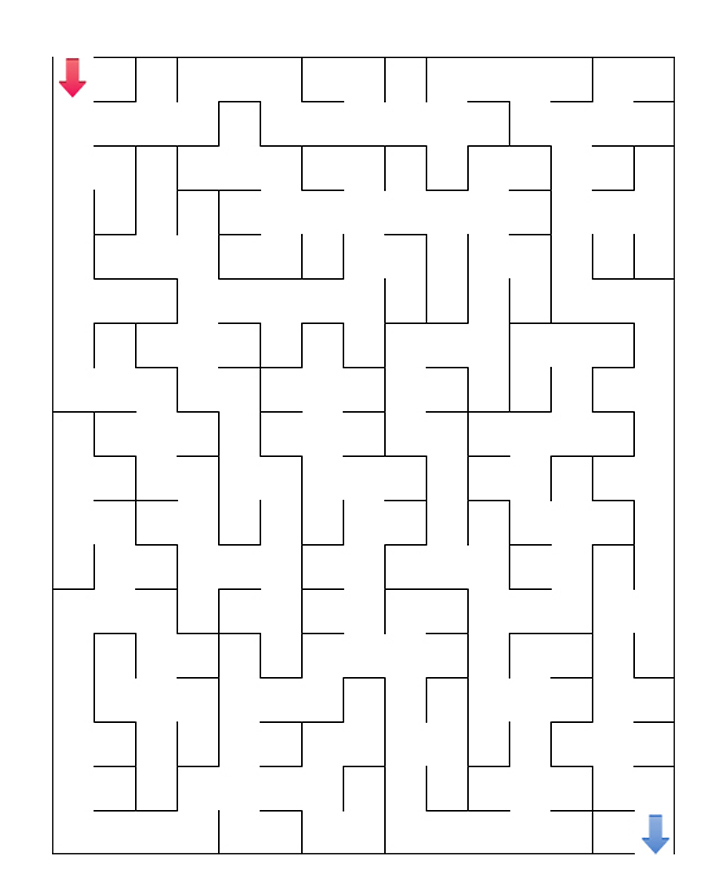 아래 그림을 보고 미로찾기(중급)를 해보세요. 빨간색 화살표에서 출발하여 파란색 화살표가 출구입니다. 미로찾기 게임은 사고력 발전과 창의성 발달에 많은 도움이 됩니다. 친구들과 함께 재미있게 풀어보세요.