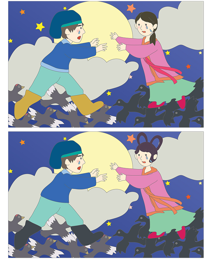 2개의 그림(견우와직녀)을 비교해보면 서로 다른 부분이 있습니다. 서로 다른 부분 5곳을 찾아 표시하는 게임입니다. 모양,위치,색상등 모든 것을 고려해 보세요. 아주 재밌는 게임이 될것입니다. 창의성 발달과 분석,비교,사고 발달에 도움이 됩니다. 난의도에 따라 시간이 많이 걸릴수 있습니다. 선생님, 부모님, 친구와 함께 즐겁게 게임해보세요. 또한 그림에 나와 있는 주제에 대해 이야기 해보면서 다양한 연관수업이 가능합니다.