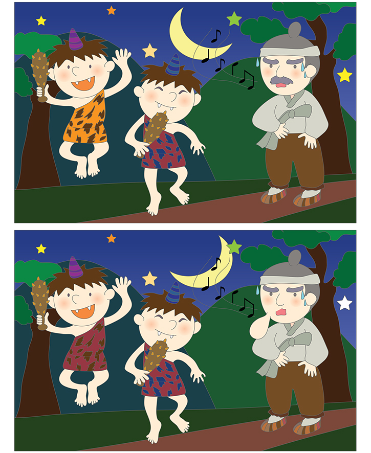 2개의 그림(혹부리할아버지)을 비교해보면 서로 다른 부분이 있습니다. 서로 다른 부분 5곳을 찾아 표시하는 게임입니다. 모양,위치,색상등 모든 것을 고려해 보세요. 아주 재밌는 게임이 될것입니다. 창의성 발달과 분석,비교,사고 발달에 도움이 됩니다. 난의도에 따라 시간이 많이 걸릴수 있습니다. 선생님, 부모님, 친구와 함께 즐겁게 게임해보세요. 또한 그림에 나와 있는 주제에 대해 이야기 해보면서 다양한 연관수업이 가능합니다.