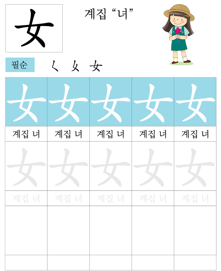 급수한자 8급 (계집 녀)를 소리내어 읽고 따라 씁니다. 반복 학습을 통해 한자를 이해합니다. 한자를 이해하면 어휘력과 음을 뜻을 자연스럽게 이해할수 있습니다. 교사와 부모는 자녀가 잘할 수 있도록 격려하고 돕습니다.
