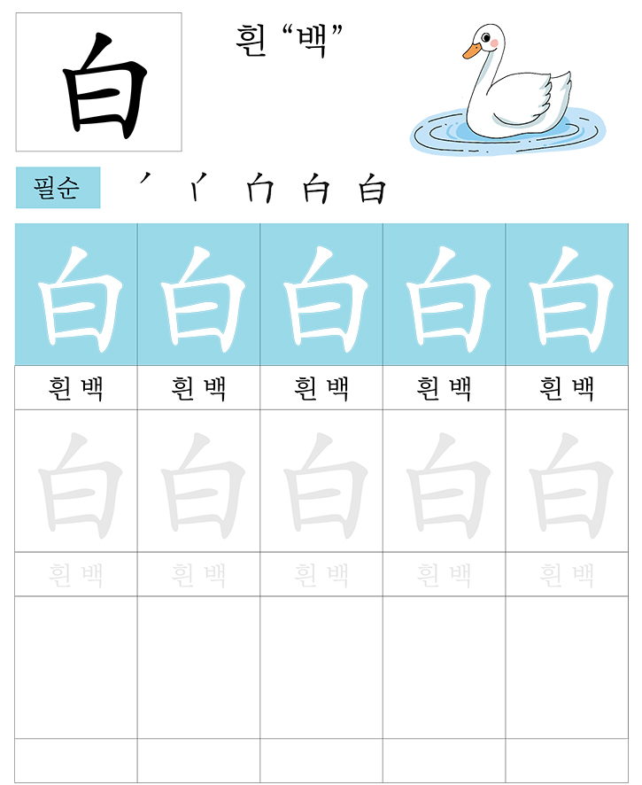 급수한자 8급 (흰 백)을 소리내어 읽고 따라 씁니다. 반복 학습을 통해 한자를 이해합니다. 한자를 이해하면 어휘력과 음을 뜻을 자연스럽게 이해할수 있습니다. 교사와 부모는 자녀가 잘할 수 있도록 격려하고 돕습니다.