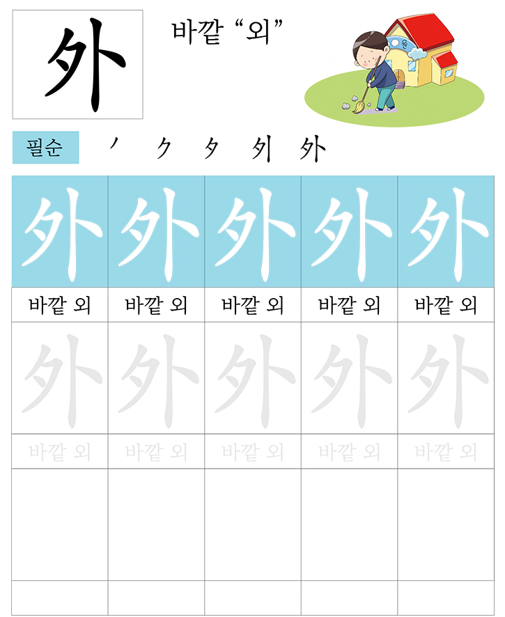 급수한자 8급 (바깥 외)을 소리내어 읽고 따라 씁니다. 반복 학습을 통해 한자를 이해합니다. 한자를 이해하면 어휘력과 음을 뜻을 자연스럽게 이해할수 있습니다. 교사와 부모는 자녀가 잘할 수 있도록 격려하고 돕습니다.