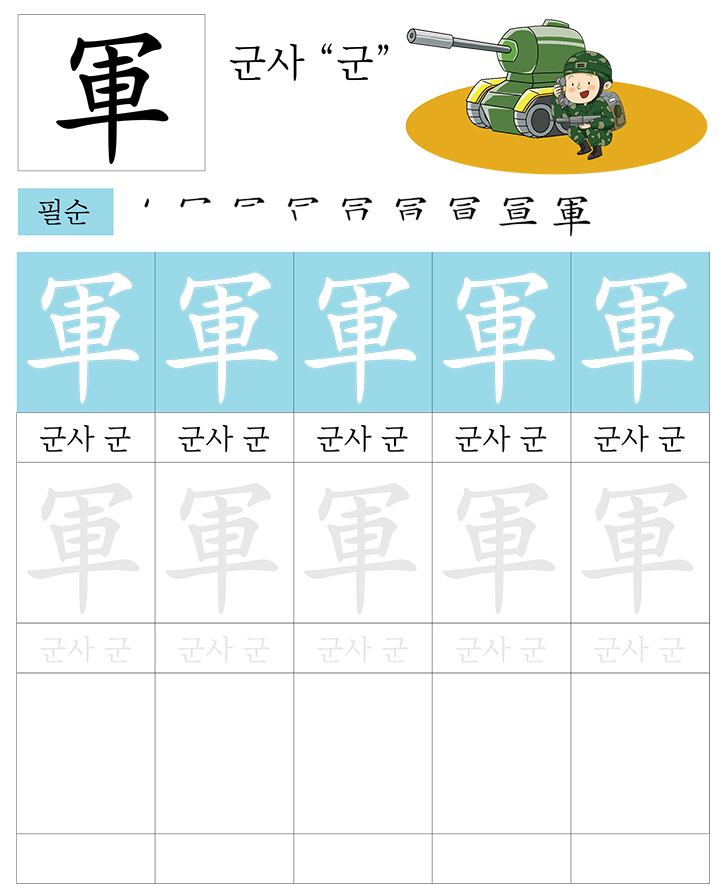 급수한자 8급 (군사 군)을 소리내어 읽고 따라 씁니다. 반복 학습을 통해 한자를 이해합니다. 한자를 이해하면 어휘력과 음을 뜻을 자연스럽게 이해할수 있습니다. 교사와 부모는 자녀가 잘할 수 있도록 격려하고 돕습니다.