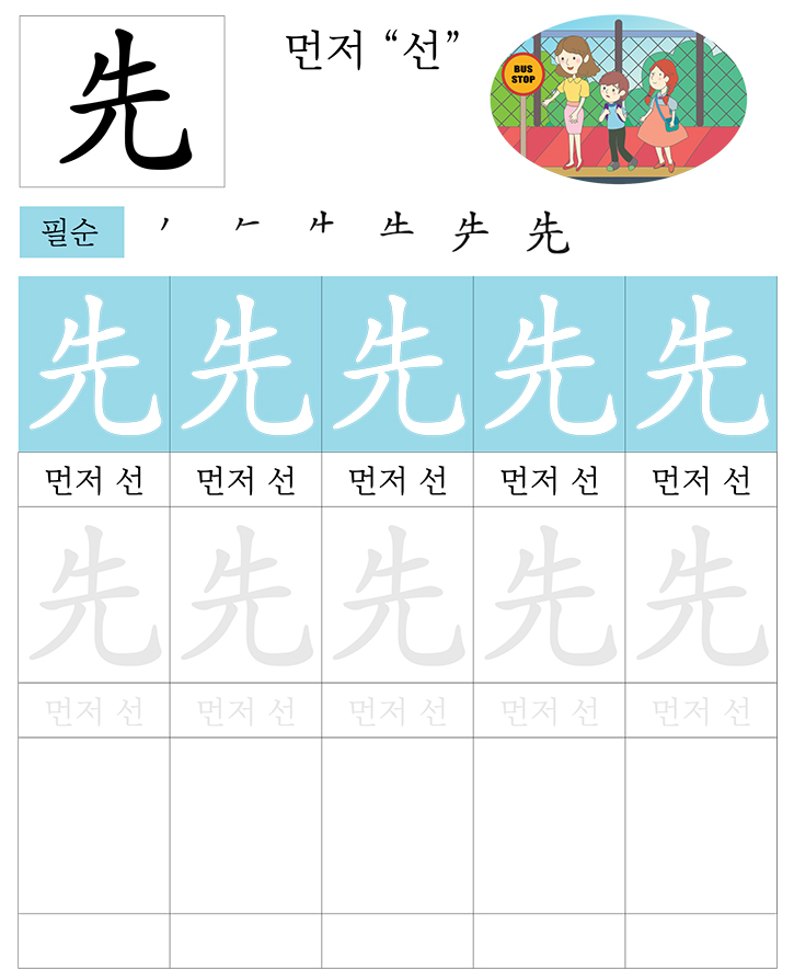 급수한자 8급 (먼저 선)을 소리내어 읽고 따라 씁니다. 반복 학습을 통해 한자를 이해합니다. 한자를 이해하면 어휘력과 음을 뜻을 자연스럽게 이해할수 있습니다. 교사와 부모는 자녀가 잘할 수 있도록 격려하고 돕습니다.