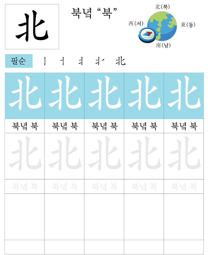 급수한자 8급 (북녁 북)을 소리내어 읽고 따라 씁니다. 반복 학습을 통해 한자를 이해합니다. 한자를 이해하면 어휘력과 음을 뜻을 자연스럽게 이해할수 있습니다. 교사와 부모는 자녀가 잘할 수 있도록 격려하고 돕습니다.