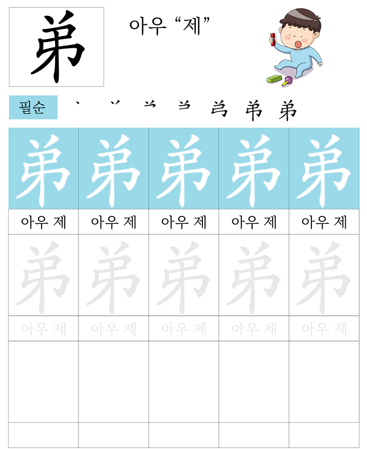 급수한자 8급 (아우 제)을 소리내어 읽고 따라 씁니다. 반복 학습을 통해 한자를 이해합니다. 한자를 이해하면 어휘력과 음을 뜻을 자연스럽게 이해할수 있습니다. 교사와 부모는 자녀가 잘할 수 있도록 격려하고 돕습니다.