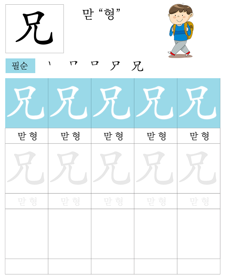 급수한자 8급 (맏 형)을 소리내어 읽고 따라 씁니다. 반복 학습을 통해 한자를 이해합니다. 한자를 이해하면 어휘력과 음을 뜻을 자연스럽게 이해할수 있습니다. 교사와 부모는 자녀가 잘할 수 있도록 격려하고 돕습니다.
