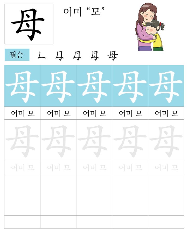 급수한자 8급 (어미 모)을 소리내어 읽고 따라 씁니다. 반복 학습을 통해 한자를 이해합니다. 한자를 이해하면 어휘력과 음을 뜻을 자연스럽게 이해할수 있습니다. 교사와 부모는 자녀가 잘할 수 있도록 격려하고 돕습니다.