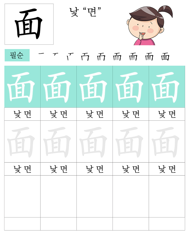 급수한자 7급 (낯 면)을 소리내어 읽고 따라 씁니다. 반복 학습을 통해 한자를 이해합니다. 한자를 이해하면 어휘력과 음을 뜻을 자연스럽게 이해할수 있습니다. 교사와 부모는 자녀가 잘할 수 있도록 격려하고 돕습니다.