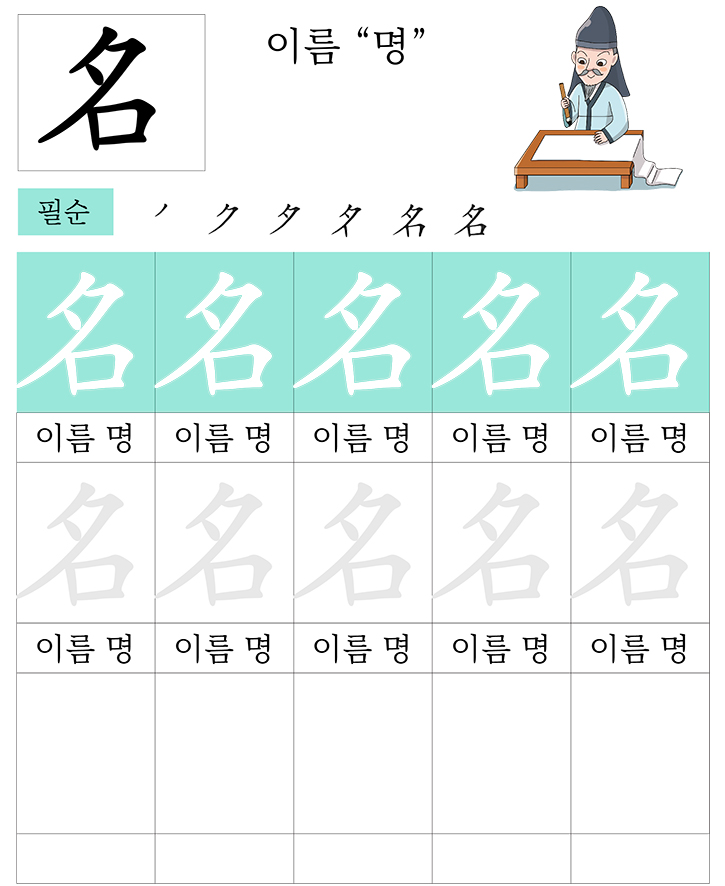 급수한자 7급 (이름 명)을 소리내어 읽고 따라 씁니다. 반복 학습을 통해 한자를 이해합니다. 한자를 이해하면 어휘력과 음을 뜻을 자연스럽게 이해할수 있습니다. 교사와 부모는 자녀가 잘할 수 있도록 격려하고 돕습니다.