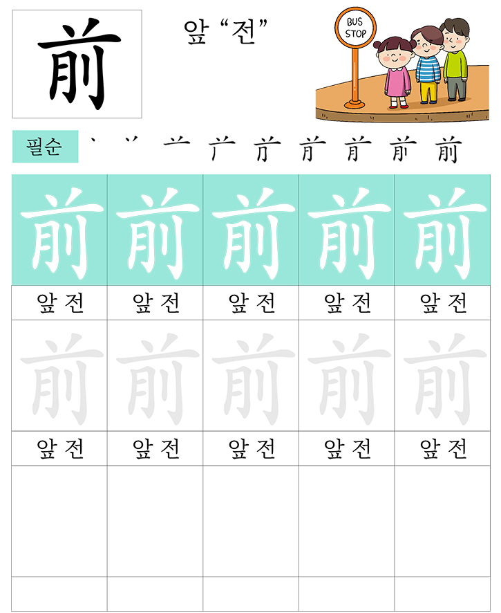 급수한자 7급 (앞 전)을 소리내어 읽고 따라 씁니다. 반복 학습을 통해 한자를 이해합니다. 한자를 이해하면 어휘력과 음을 뜻을 자연스럽게 이해할수 있습니다. 교사와 부모는 자녀가 잘할 수 있도록 격려하고 돕습니다.
