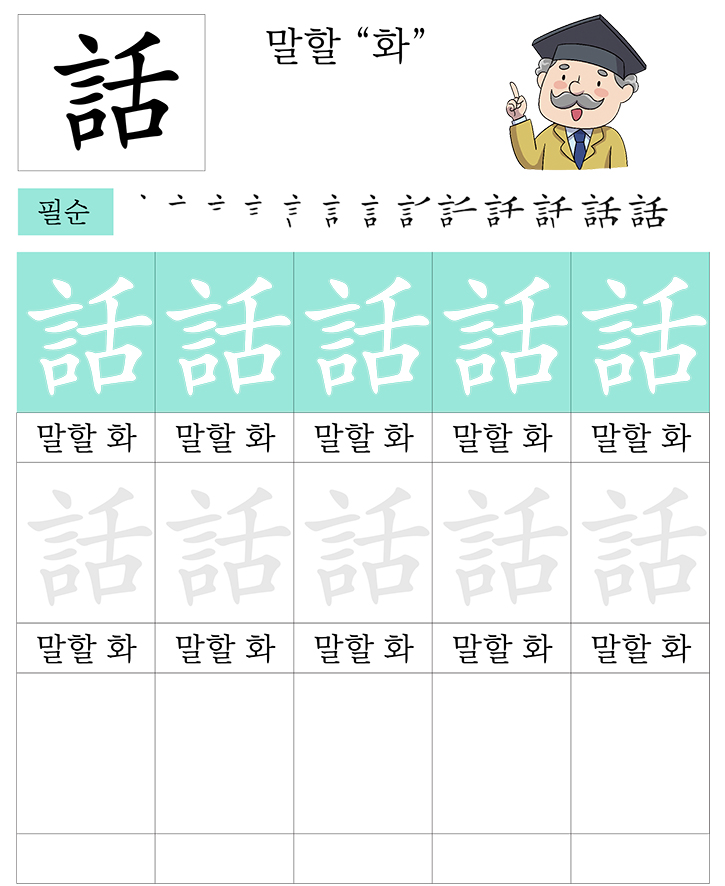 급수한자 7급 (말할 화)을 소리내어 읽고 따라 씁니다. 반복 학습을 통해 한자를 이해합니다. 한자를 이해하면 어휘력과 음을 뜻을 자연스럽게 이해할수 있습니다. 교사와 부모는 자녀가 잘할 수 있도록 격려하고 돕습니다.