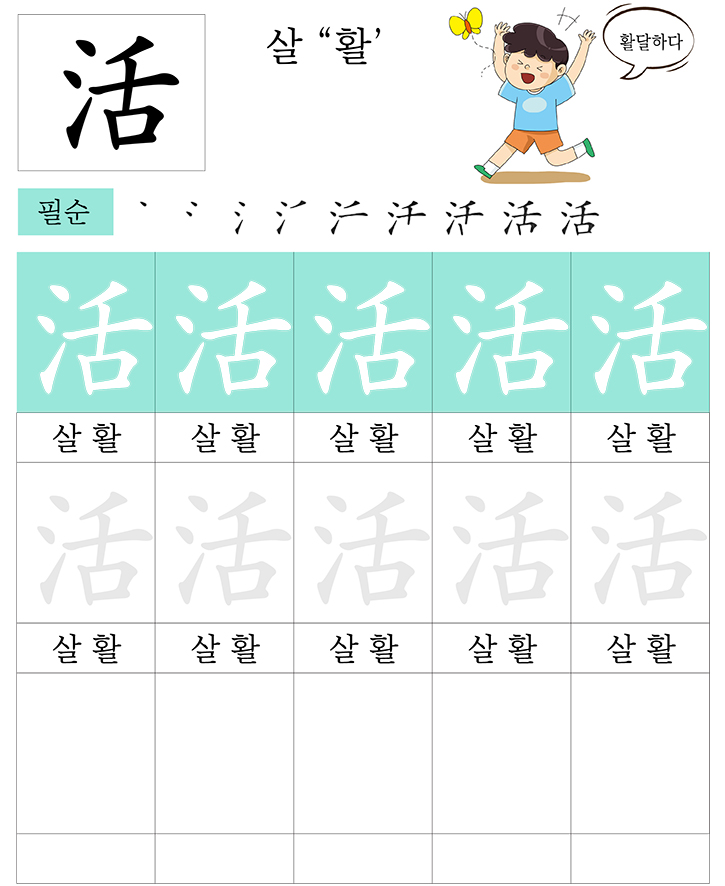 급수한자 7급 (살 활)을 소리내어 읽고 따라 씁니다. 반복 학습을 통해 한자를 이해합니다. 한자를 이해하면 어휘력과 음을 뜻을 자연스럽게 이해할수 있습니다. 교사와 부모는 자녀가 잘할 수 있도록 격려하고 돕습니다.